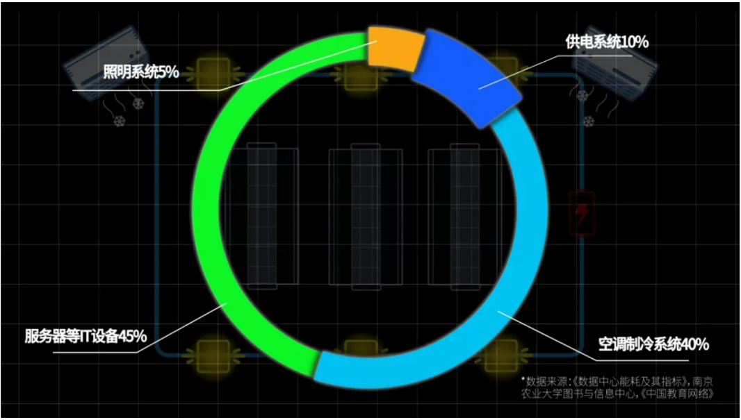 A traditional data center’s energy consumption comes mainly from servers, other IT equipment, air conditioning systems, power supplies and distribution systems, and lighting. Surprisingly, air conditioning turns out to be the biggest contributor to electricity consumption as it works to keep server rooms from overheating.