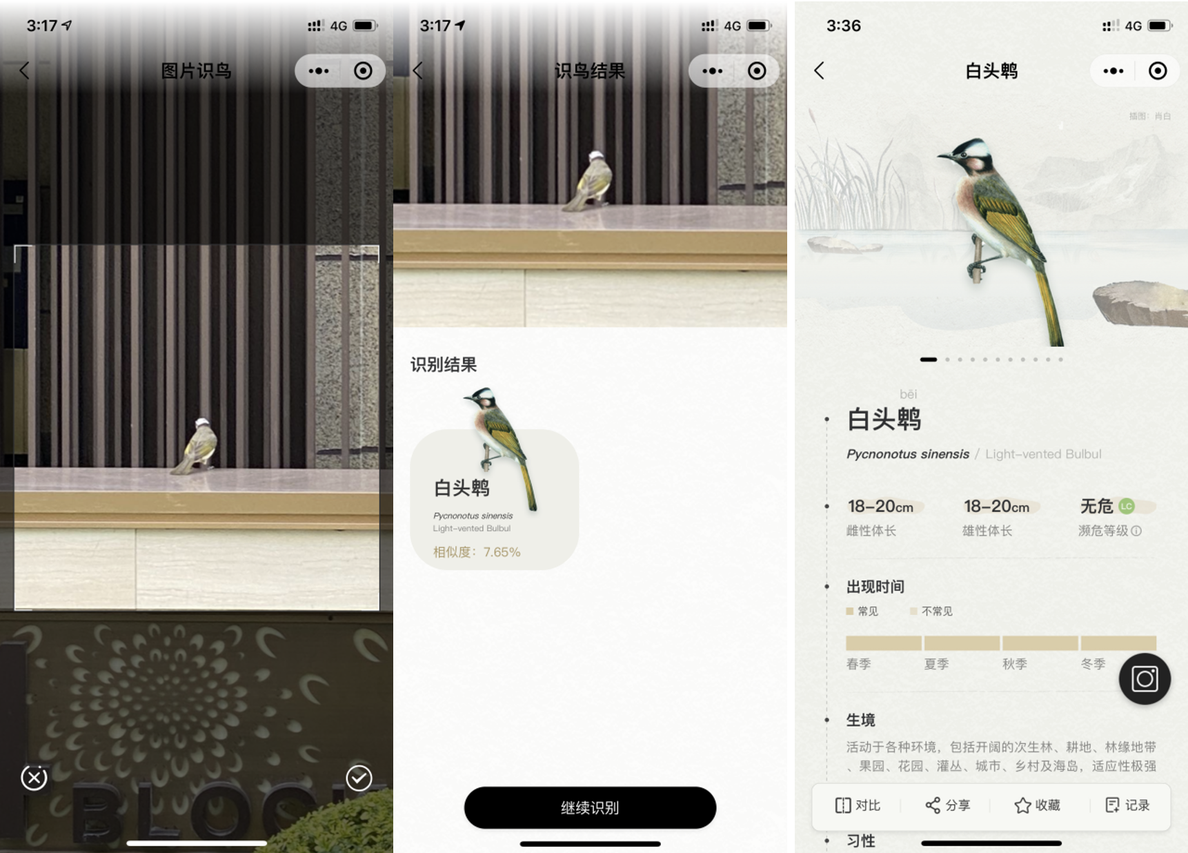 WeBirder identifies a Pycnonotus sinensis through the image recognition technology, and shares more information about the species.
