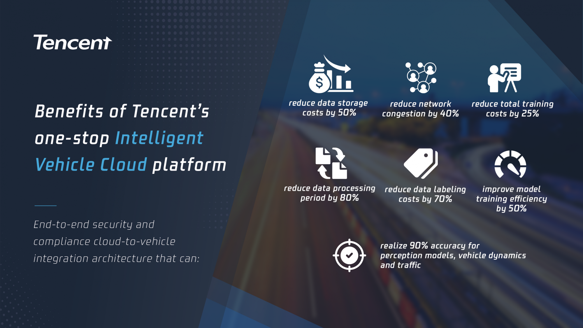 Our advanced cloud data storage ecosystem addresses challenges around the huge data volume and high storage costs involved in the development of AD. Tencent’s flexible out-of-the-box, low-cost tools also ensure a smooth user experience. Meanwhile, end-to-end security and compliance in our cloud-to-vehicle integration architecture resolve complex compliance issues when entering a new market.